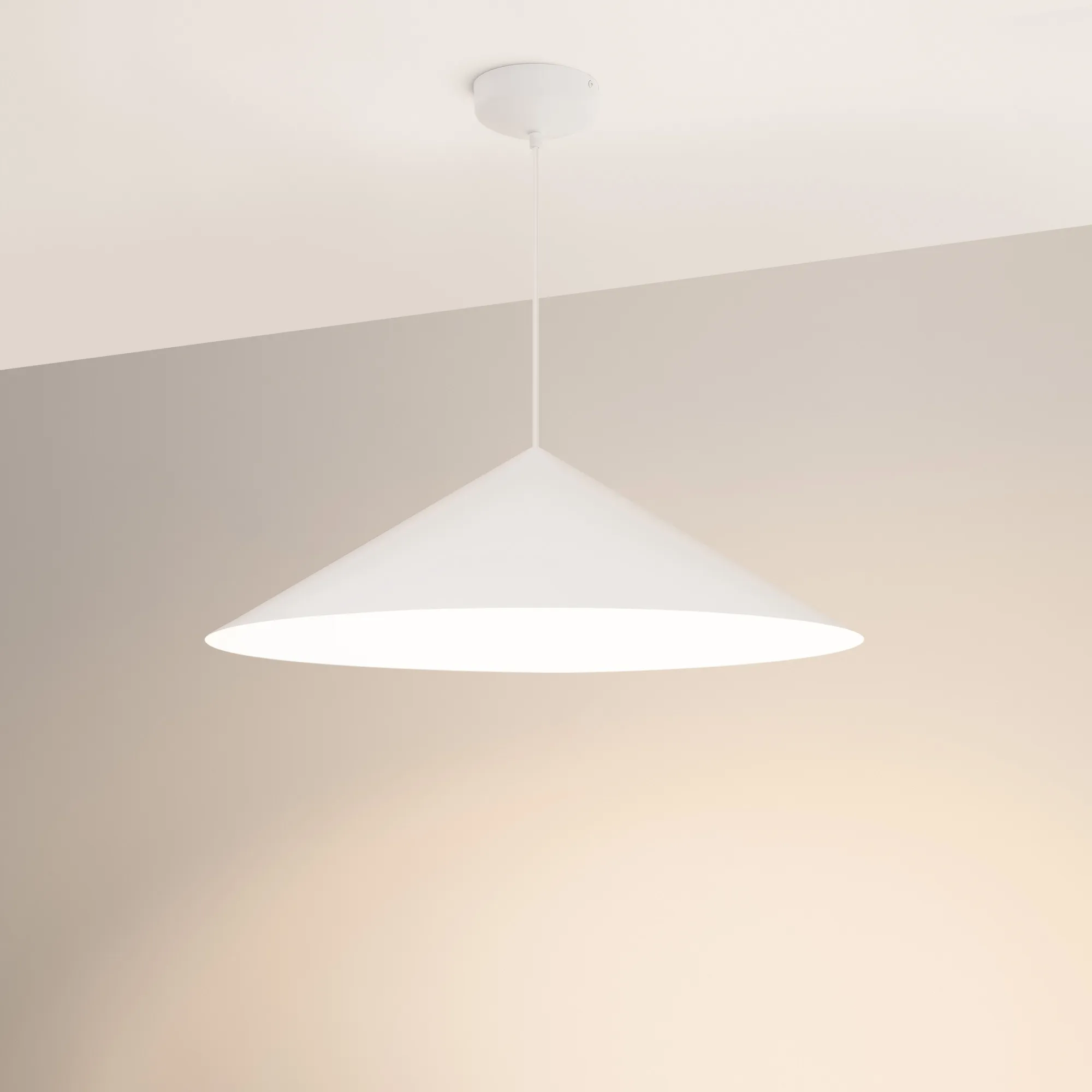 Подвесной светильник. Мощность 14 Вт, св. поток 1200 лм, 90 лм/Вт, теплый 3000 K, CRI>92, угол 36°, напряжение питания 230 В. Белый корпус из алюминия в форме конуса с белой внутренней поверхностью, линза-рассеиватель из PMMA, степень защиты IP20. Размер: диаметр 750 мм, высота 230 мм. Монтаж подвесной, длина подвеса 2000 мм, регулируемая. В комплекте 2 вида чаш. Габариты встраиваемой чаши: Ø 80x23 мм. Габариты накладной чаши Ø140x55 мм. Драйвер 27-42 В, 350 мА, пульсация <1%. Управление по TRIAC.