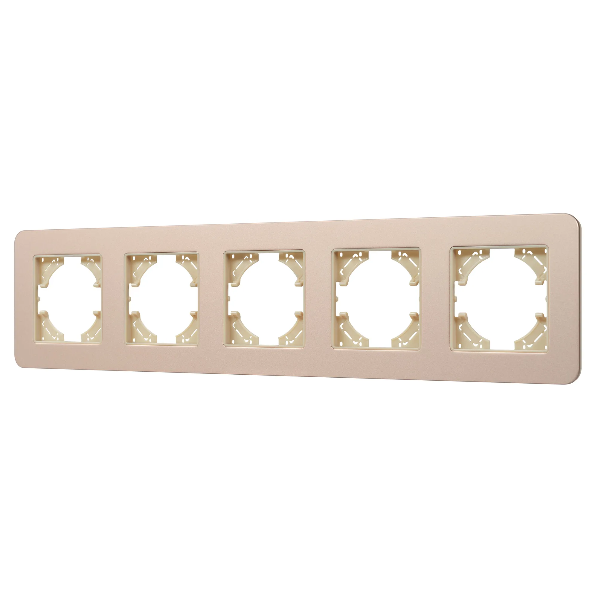 Рамка алюминиевая на 5 постов, под встраиваемый механизм. Цвет - золотой с Soft-Touch покрытием. Уровень герметичности IP20. Ориентация монтажа - горизонтальная (основным ориентиром служат посадочные выступы для накладки механизма).